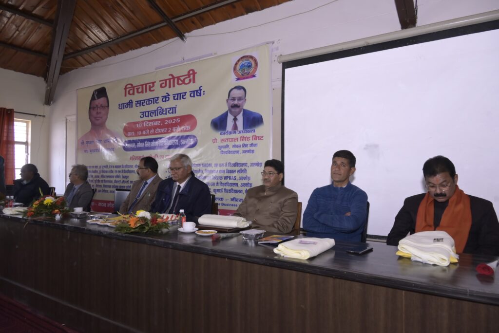 सोबन सिंह जीना विश्वविद्यालय के गणित विभाग के ऑडिटोरियम में आयोजित इस गोष्ठी का उद्देश्य बीते चार वर्षों में राज्य में हुए विकास कार्यों की समीक्षा, जनकल्याणकारी योजनाओं के प्रभाव का आकलन तथा भविष्य की प्राथमिकताओं पर सार्थक विमर्श करना रहा। गोष्ठी में राज्य सरकार की उपलब्धियों और चुनौतियों को लेकर विचार साझा किये गए। वक्ताओं ने कहा कि प्रधानमंत्री नरेंद्र मोदी के मार्गदर्शन में मुख्यमंत्री पुष्कर सिंह धामी केंद्र सरकार से बेहतर समन्वय स्थापित करते हुए राज्य को आगे बढ़ाते हुए नजर आ रहे हैं।