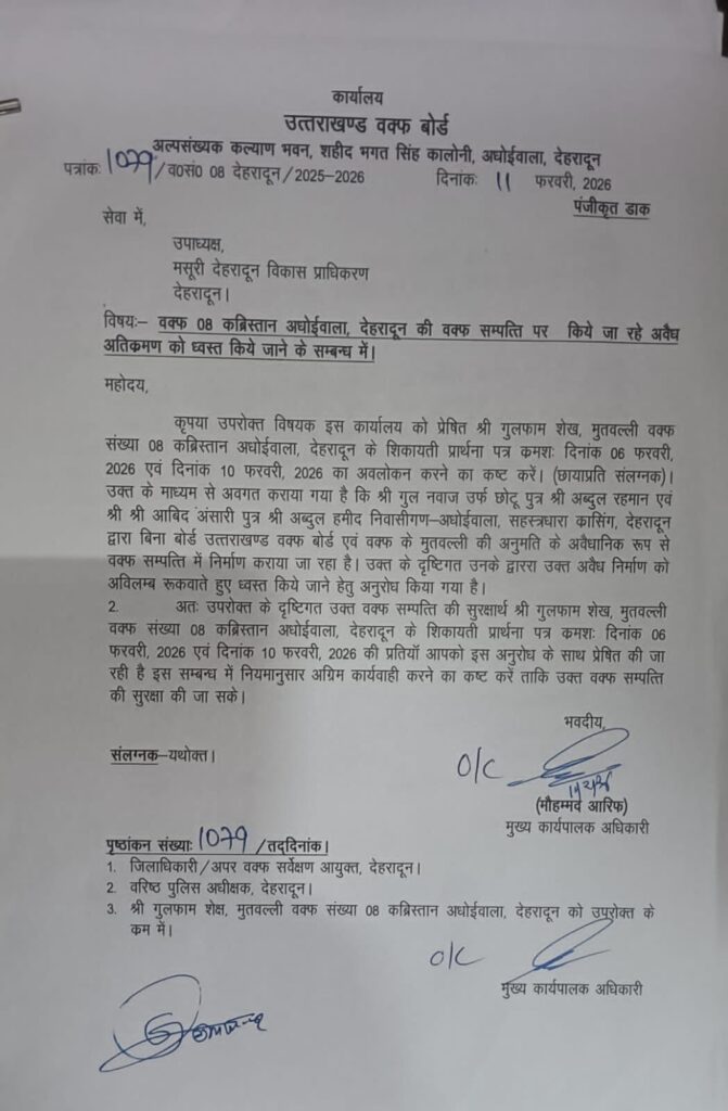 मामले की गंभीरता को देखते हुए पत्र की प्रतिलिपि जिलाधिकारी, अपर वक्फ सर्वेक्षण आयुक्त, वरिष्ठ पुलिस अधीक्षक देहरादून और संबंधित मुतवल्ली को भी भेजी गई है, ताकि वक्फ संपत्ति की सुरक्षा सुनिश्चित की जा सके।