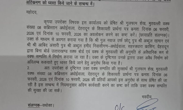 मुख्य कार्यपालक अधिकारी की ओर से 11 फरवरी 2026 को जारी पत्र में कहा गया है कि कब्रिस्तान अधोईवाला के मुतवल्ली श्री गुलफाम शेख ने 6 फरवरी और 10 फरवरी 2026 को प्रार्थना पत्र देकर शिकायत दर्ज कराई है। शिकायत में आरोप लगाया गया है कि कुछ व्यक्तियों द्वारा वक्फ बोर्ड एवं मुतवल्ली की अनुमति के बिना वक्फ संपत्ति पर निर्माण कार्य कराया जा रहा है।
