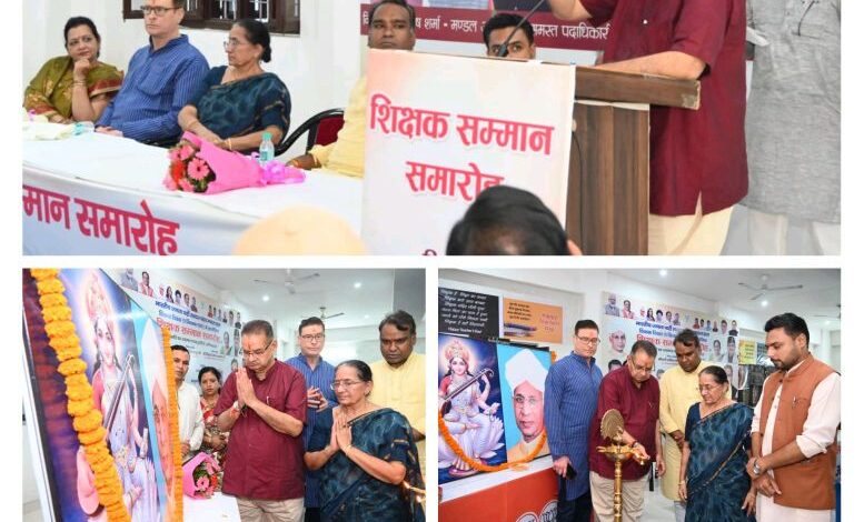 कैबिनेट मंत्री गणेश जोशी ने आज देहरादून जीएमएस रोड़ स्थित सामुदायिक भवन इन्दिरापुरम में भारतीय जनता पार्टी सरदार पटेल मण्डल कैंट विधानसभा द्वारा शिक्षक दिवस के अवसर पर आयोजित सम्मान समारोह कार्यक्रम में बतौर मुख्य अतिथि प्रतिभाग किया। इस अवसर पर मंत्री जोशी ने उत्कृष्ट कार्य करने वाले शिक्षकों को शॉल व स्मृति चिन्ह देकर सम्मानित किया।