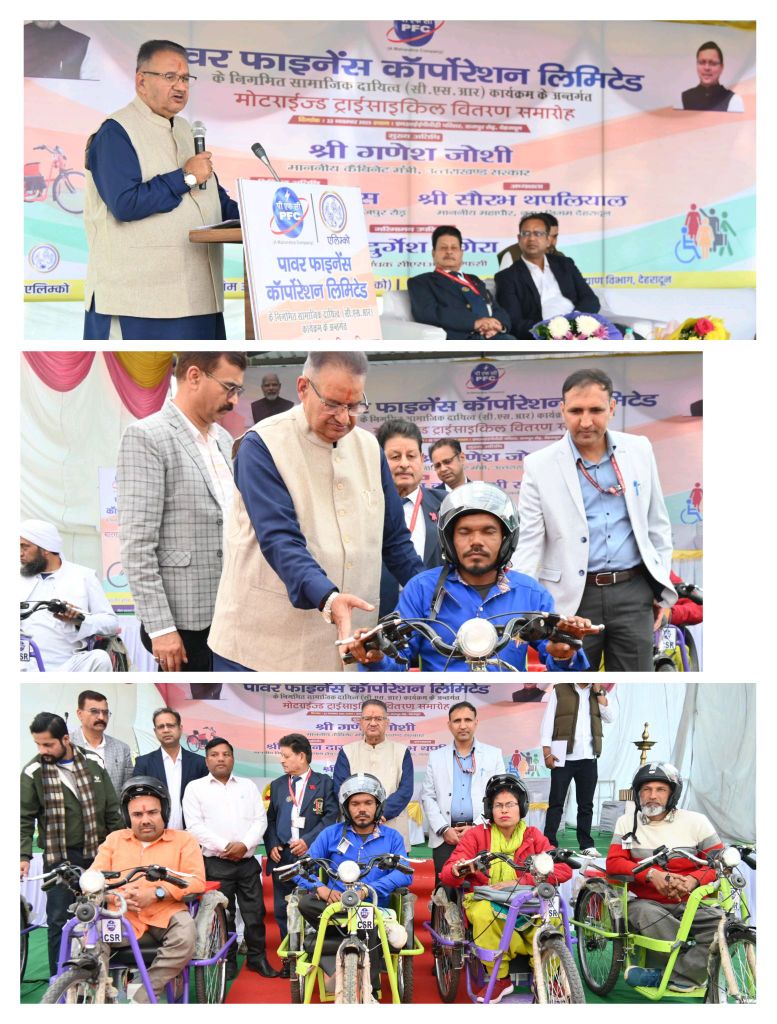 कैबिनेट मंत्री गणेश जोशी ने देहरादून के राष्ट्रीय दृष्टि दिव्यांगजन सशक्तिकरण संस्थान परिसर में एलिम्को के माध्यम से आयोजित दिव्यांगजनों को मोटराइज्ड ट्राईसाइकिल (इलेक्ट्रिक) वितरण कार्यक्रम में मुख्य अतिथि के रूप में प्रतिभाग किया। कार्यक्रम में पावर फाइनेंस कॉर्पोरेशन लिमिटेड (पीएफसी) की सीएसआर निधि से 169 दिव्यांगजनों को निशुल्क इलेक्ट्रिकमोटराइज्ड ट्राईसाइकिलें वितरित की गईं।