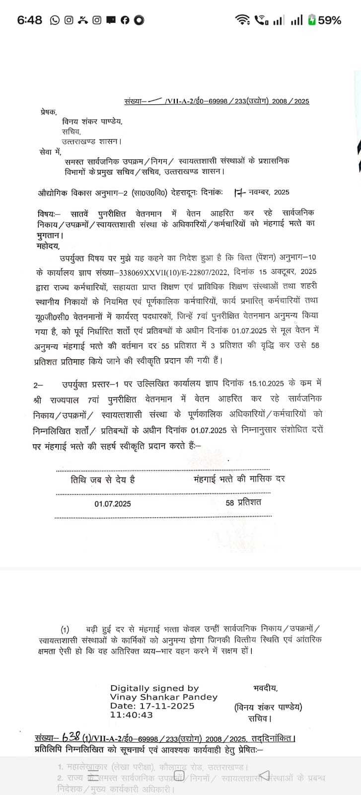 देहरादून। मुख्यमंत्री पुष्कर सिंह धामी के नेतृत्व में राज्य सरकार ने कर्मचारियों को बड़ी राहत देते हुए महंगाई भत्ते (DA) में 3 प्रतिशत की वृद्धि को मंजूरी दे दी है। धामी सरकार लगातार कर्मचारियों के हितों के प्रति गंभीर रही है, और उसी क्रम में सातवें पुनरीक्षित वेतनमान में वेतन आहरित कर रहे सार्वजनिक निकायों, उपक्रमों व स्वायत्तशासी संस्थाओं के अधिकारियों–कर्मचारियों के लिए DA को 55% से बढ़ाकर 58% किए जाने का निर्णय लिया गया है। नई दरें 1 जुलाई 2025 से लागू होंगी।