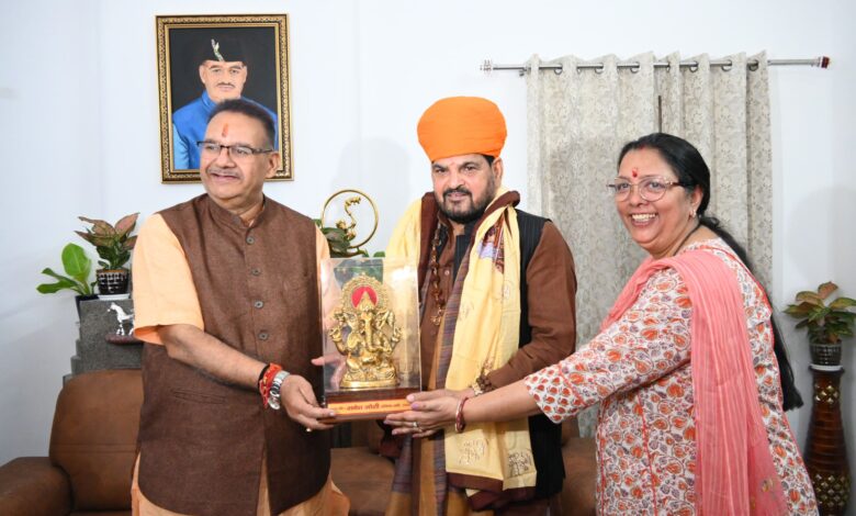 उत्तराखण्ड के कैबिनेट मंत्री गणेश जोशी ने आज देहरादून स्थित अपने आवास पर पूर्व सांसद एवं भारतीय कुश्ती संघ के अध्यक्ष बृजभूषण शरण सिंह का हार्दिक स्वागत किया। इस अवसर पर मंत्री जोशी ने पुष्पगुच्छ भेंट कर उनका अभिनंदन किया और उनके साथ विभिन्न सामाजिक एवं राजनीतिक विषयों पर विचार-विमर्श किया। उन्होंने सम्मान स्वरूप श्रीगणेश जी की मूर्ति भेंट की।