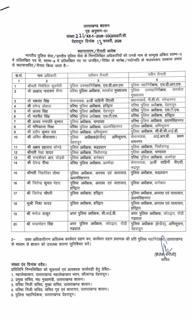 प्रदेश के मैदानी क्षेत्र में बढ़ते अपराध को देखते हुए मुख्यमंत्री धामी ने देहरादून समेत कई जिलों के कप्तानों के किये ट्रांसफर आदेश जारी, राजधानी देहरादून के पुलिस अधीक्षक अजय सिंह को एस पी एसटीएफ हरिद्वार के एसएसपी प्रमेन्द्र डोबाल को एसएसपी हरिद्वार व ऊधम सिंह नगर समेत कई जिलों के कप्तान व पुलिस विभाग के अन्य कई उच्चाधिकारियों के हुए ट्रांसफर लिस्ट जारी….