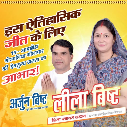 उन्होंने इस सफलता का श्रेय जनता के विश्वास, अपने पति अर्जुन बिष्ट के संघर्ष और निरंतर मेहनत को दिया। लीला बिष्ट ने भरोसा दिलाया कि अब चोरगलिया और गौलापार क्षेत्र में तेज़ी से विकास कार्य कराए जाएंगे और जनसमस्याओं का पारदर्शिता के साथ समाधान किया जाएगा।