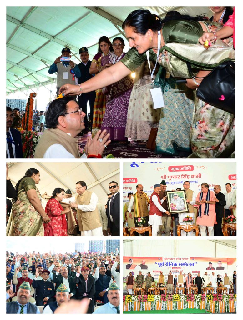 मुख्यमंत्री पुष्कर सिंह धामी ने गुरूवार को राज्य स्थापना की रजत जयंती के अवसर पर हल्द्वानी के एम.बी.पी.जी. कॉलेज प्रांगण में आयोजित ‘पूर्व सैनिक सम्मेलन’ का शुभारंभ किया। इस अवसर पर प्रदेशभर से बड़ी संख्या में पूर्व सैनिकों, वीर नारियों, वीरांगनाओं एवं उनके परिजनों द्वारा प्रतिभाग किया गया।