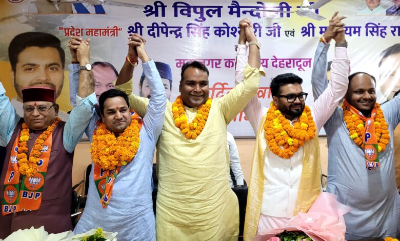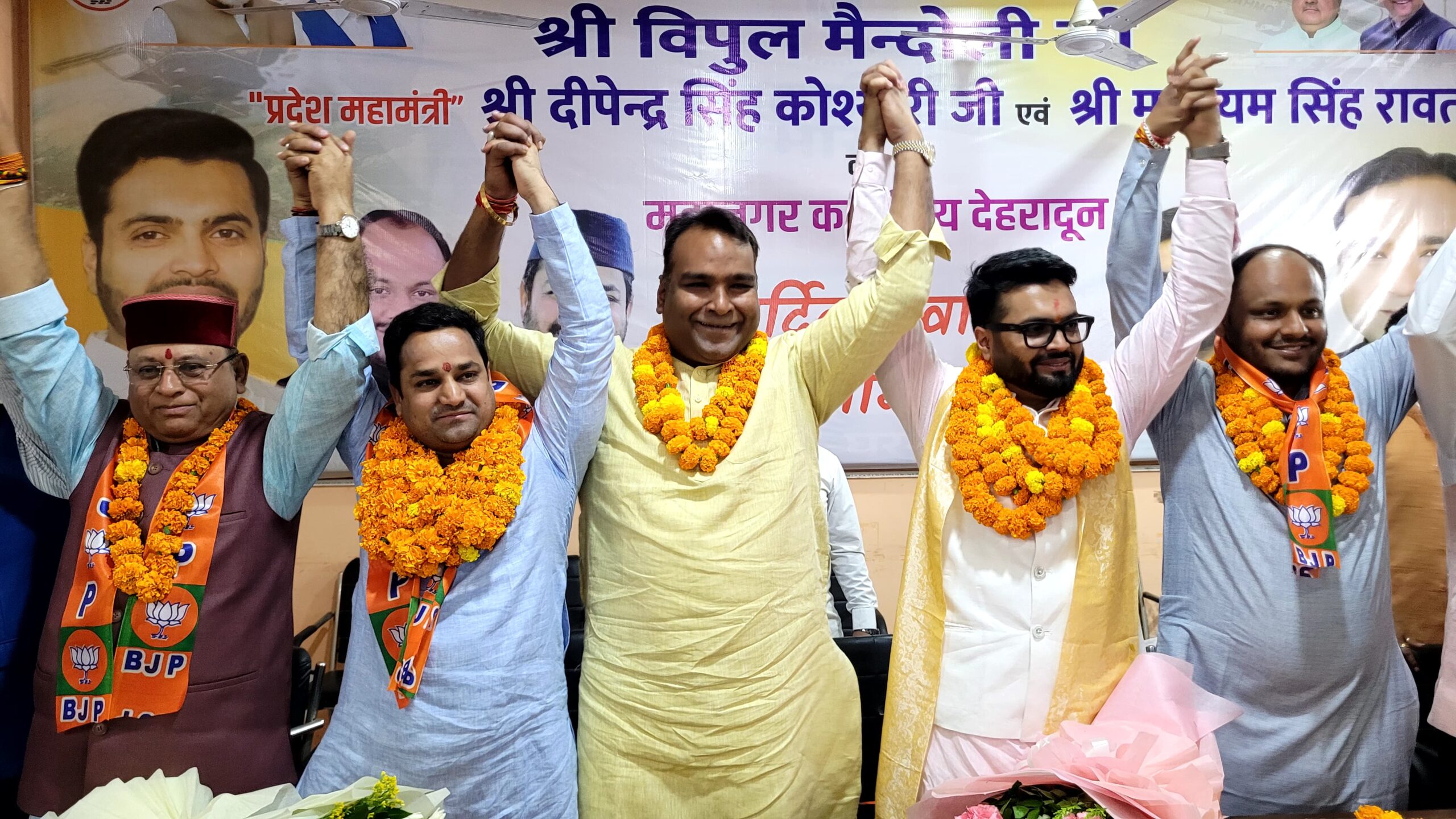देहरादून, 26 अक्टूबर। भारतीय जनता पार्टी महानगर देहरादून के अध्यक्ष श्री सिद्धार्थ उमेश अग्रवाल की अध्यक्षता में आज भाजपा महानगर कार्यालय में भारतीय जनता युवा मोर्चा (भाजयुमो) के प्रदेश पदाधिकारियों का भव्य स्वागत एवं अभिनंदन कार्यक्रम आयोजित किया गया। इस अवसर पर भाजयुमो प्रदेश अध्यक्ष विपुल मैंदोली, प्रदेश महामंत्री मुलायम सिंह रावत एवं दीप कोश्यारी (दीपेंद्र) मुख्य अतिथि के रूप में उपस्थित रहे।